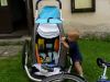 Taky jsem musel občas absolvovat silnici. Auta nás míjela s větším odstupem, než když jsem jsem jel sám na kole. Pokud bys sehnal Croozer s gumovým odpružením od Fialy, tak na díry a kanály můžeš v podstatě zapomenout. Děcko bude jako v Cadillacu. A ještě protipylovou síťku na předek – ta řeší prach od zadního kola.