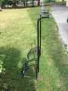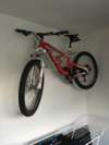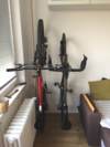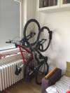 Klasický stojan na kola se mi nelíbí, nikdy nevím jak šetrně se ke kolu bude chovat někdo jiný a když spadne sousedovo kolo na moje, tak to hrozí poškozením výpletu. Napadla mě klasická tyč, na které se kolo pověsí za sedlo, ale tam je zase nevýhoda různé velikosti kol + nedá se tam koloběžka