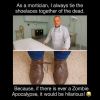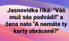 Chviličku před započetím smutečního obřadu se obřadník v síni otočí ke stařičké vdově a ptá se: „Kolik bylo vašemu manželovi?“ „Devadesát vosum“, odpoví vdova, „byl o dva roky starší než já.“ „Takže vám je tedy devadesát šest“ podotkne obřadník. Dáma odpoví: „Už skoro nemá cenu chodit domů, co?“