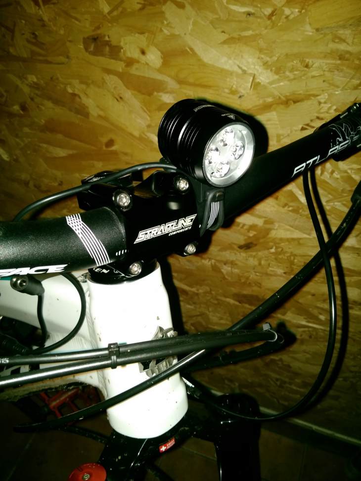 Moc pěknej kužel i se standartní optikou, zatím nemám potřebu zkusit přiloženou wide. Na bězný trailování po lese stačí druhej stupeň ze čtyřech. Neutral white je o dost příjemnější než cool white. Na řídítkách se ani nehne. Zatím ☺