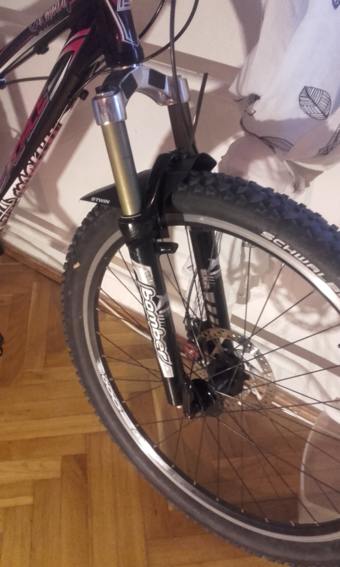Reinkarnace meho stareho Rockmachine Tsunami do damskeho kola. Postaveno z dilu co dum dal. Naklady ca. 4000Kc. Jak to u zen byva, zakladni pozadavek byl kladen na vzhled a pohodli, zde jsem vyhovel:-) Prevod 32×11–32 byl zvolen z duvodu: „Me to tady vepredu porad nejak pada a zasekava se“:-) Zdvih vidlice puvodne upraven na 100mm, po reinkarnaci snizen na ca. 60mm (aby se to pri brzdeni moc neborilo).