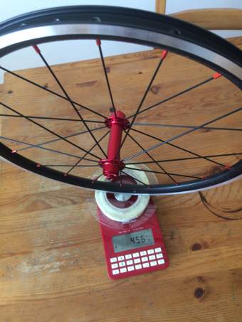 P456g + Z593g = 1049g Celková vaha kola+upínáky+pláště+kazeta+ventilky+mlíko = 2394g Původní kola měla 3559g, takže úspora jen na kolech krásných 1165g :-)