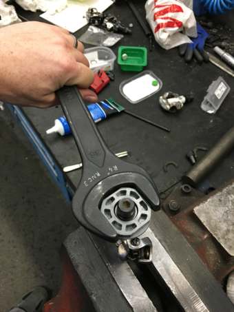 velky klic netreba, staci ten plastovy bazmek dat do sveraku a tocit pedalem omotanym hadrem normalne rukou ;-)