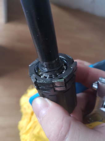 Malou černou plošku na fotce 1 upneš do svěráku osou (levym koncem) dolů. Nahoře nad ořechem nasadíš na 2 matice 2 konusové klíče, ten níže přitáhneš dokud necítíš jak si kuličky sednou, pak o cca půl otáčky povolíš a na přidrženou spodní matici dotáhneš horní. Následně vyzkoušíš jestli se ořech točí hladce a zároveň nemá vůli a podle potřeby povolíš vrchní matici, upravíš spodní (vůle = přitáhnou, netočí se =povoli), zase utáhneš horní a znova zkontroluješ dokud to nebude naprosto úžasný. Pak to celý strčíš nebo naklepneš do náboje a našroubuješ tam levou koncovku. Tak nějak rozumně, už to jsou průmyspový ložiska = vymezuješ akorát aby v nich osa nevaklala axiálně. Toť vše. Osobně bych oba konce zajistil kapičkou nízkopevnostního závitovýho lepidla (fialovej loctite), aplikuje se před našroubovánim matic/koncovek na závity.