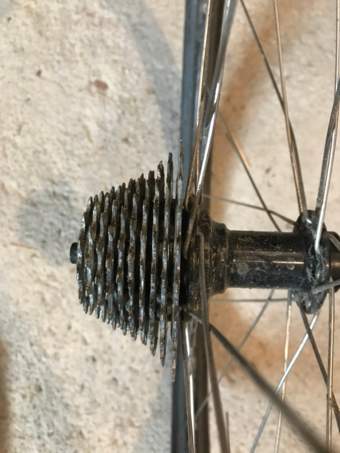 Miche to má opačně. Zuby má rovně, ale vyhnutí je dole u ořechu. A to vyhnutí se nemůže projevit, protože to dole dosedlo na náboj. I v originálním případu je mezi posledním pastorkem a tělem nábojem max 0,2mm místa.