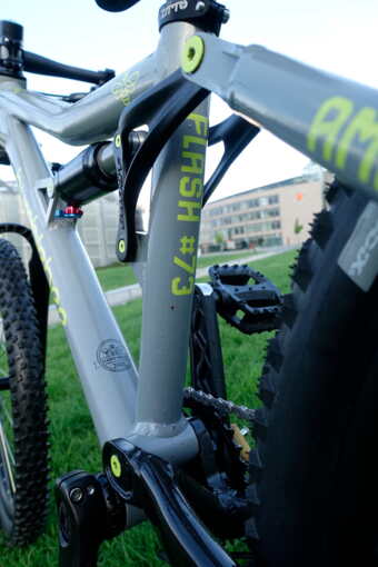 Stavbu jsem myslím dostatečně popsal ve fotogaleriích. Od začátku zamýšleno jako bike s úhlem 65, zdvihy cca 120 (vzadu jsem vydoloval 118). Zároveň, protože jsem to „krájel“ z rámu 26", chtěl jsem zachovat možnost výhledově nahodit kola 26. S růstem jezdkyně souvisí i průchodka v rámu na bowden teleskopu. Zatím jsme nikde pořádně nebyli, ale je jisté, že to chodí i pod těma necelýma 30ti kilama.