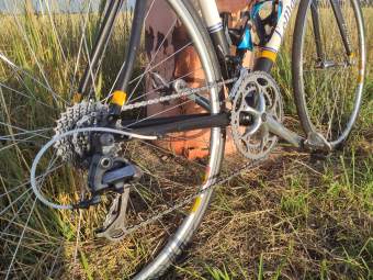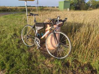 Kolo z bazose původně v důchodcovské úpravě s rovnými řídítky. Rám dodrbaný nastříkaný černým sprejem + nějaké reflexní zlaté doplňky, komponenty většinou Ultegra řady 6500 z různých jiných kol, řazení 10sp zbylo z původní závodní Madony. Šaltr XTR jen tak na image -) Ráfky Open Pro ve stříbru jsem vždy chtěl, takže kousnu i vyšší váhu setu. Posed jsem musel doladit skloněným představcem a wcs hlávkem abych se dostal adekvátně dolů. Brzdy jsou lehce zvednuté, ale já tak prostě jezdím. Pave sedlo je příjemné křeslo a bylo doma -) Rám je základní hlína z roku 2005, z dálky vypadá dobře a už jsem si na něj za cca 6500km zvyknul. Beztak již od zranění skoro půl roku jezdím hovno, tak vlastnosti neřeším a prodat ho za flašku lepšího rumu je škoda -)