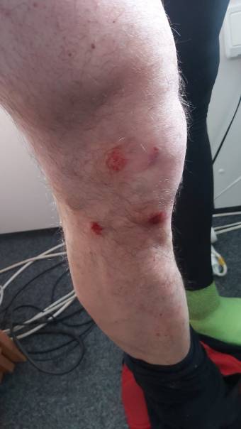 Au … bolí mě to asi stejně. Lehnul jsem kvůli písku u kolejí v neděli v Brně u Zvonařky. Hlavně že jsme celí. Ale hadry všechny taky na odpis a spíše hledám na těle místo, které mě nebolí. Něco už i začalo hnisat, tak to rychle spravil řepík lékařský. No ale protože mám kolo jako dopravní prostředek, tak zítra prostě do práce musím a bude to dost bolet.