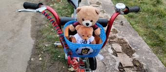 Tak méďa má košík na kole a má parádní výhled z košíku i jeho mladší bráška medvídek.