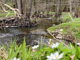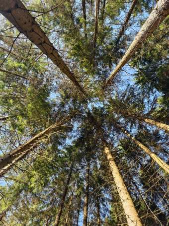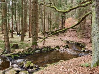 V Pohorské Vsi mě rychle opouští cestovatelský entuziasmus, obzvlášť když lákavě vyhlížející restaurační zařízení s hejnem stolků venku a tabulí, ďábelsky lákající na nakládaný hermelín, gulášovou polívku a paštiku z jepičích stehýnek (halucinace?) otvírá dle kolozubého místňáka až na Velikonoce. Pozřu pár buráků, vyžiju se v drcení jejich slupek, majíc před duševním zrakem krk pana hostinského. Na schodech před kostelem chytám poslední teplo sklánějícího se slunce a víceméně nazdařbůh píchám prstem do mapy v mobilu – bývalá osada Starý Holand. Kousek odsud, stranou od silnice, potok, les (čti: dříví) a možná bude i strašidlo. Ze znouzectnosti se nakonec vyklube úchvatné místo s nachystaným ohništěm, naplaveninami čisťounkého písku pod unavené tělo, něžně zurčícím křišťálovým potokem, spoustou suchých klacíků vůkol a příhodným listnáčem, který má v genetické výbavě zakódováno produkovat dokonalé opékací pruty. Špekáčky nakonec potěší i bez hořčice a zubří jedenáctka, se kterou se vleču speciálně pro tuhle příležitost, dotáhne tichý večer k dokonalosti. V noci se na mě v lehkém větru snáší drobné jehličí, odjíždí pode mnou karimatka, kousek od mé hlavy něco zvláštně ťuká-pípá-houká. Dávní osadníci jsou rádi, že si mají z koho dělat srandu :-)