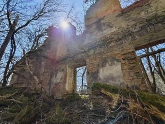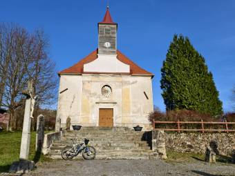 Sjíždím do Kaplice a užívám si to rozmarné ztrácení těžce nastoupaných metrů. Však ono na ně zase dojde. Trochu na sílu do sebe nacpu Froňkův dechberoucí číz v housce (jídlo je třeba nemíjet, moc toho nevezu), za Kaplicí se chvilku nechávám táhnout Malší a pak zamířím k jihovýchodu pustým lesnatým krajem vysídlených osad. Příhraniční nicotě uniklo jen pár obcí, mě z nich nemine Bukovsko a z něj vyčerpávající stoupání na kopec s příznačným jménem Vyhlídka. Tmí se mi před očima a mám mírně rozostřeno, ale jo, výhled do dáli i šíře. Pak už jenom vyhlížím lesní odbočku, která mě má dopravit do blízkosti zřícené kaple Panny Marie Pomocné, kvůli níž speciálně brousím takhle hodně k jihu. Je tam, uprostřed luk, v zádech lípu, s kterou se tu živly taky moc nemazlily, se zbytky fresek na kamenných zdech a lomeným kamenným obloukem ve vstupu. A obklopená stádem krav. Takže nic, napínám zoom mobilu, až v něm praská, páč mezi pubertální jalovice nejdu ani omylem. Trochu zklamání, ale co už. Aspoň že se nakonec milostivě odklackovaly ze záběru.