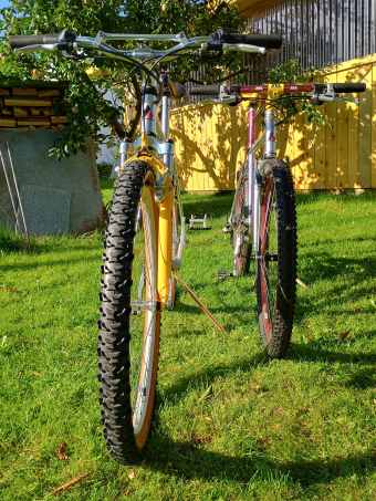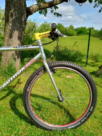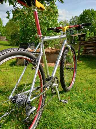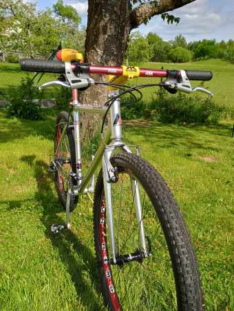 no a jednou na hudebnim táboře..bylo to někdy z jara minulý rok, jsem zase seděl u počítače a procházel bazary. Vzhledem k tomu, že jsem daný model mohl zahlédnout leda ze sedačky kočárku, moc jsem toho o legendě jménem Sector nevěděl. Rozklikl jsem inzerát, viděl tu barevnou hitparádu a na první dobrou si řekl něco jako „ty vole, to je dobrej tuning“. Jenže pak jsem viděl tu vidlici z pekla, všiml si, že rudý ráfky, řidítka a sedlovka jsou spíš elox, než tunerskej nástřik a dal jsem se do googlení. Prakticky hned jsem narazil na tu hromadu „Starých kol“ a všechno bylo jasnější (mimochodem palec nahoru autorovi, vím, že tu jsi mezi námi a já jsem od těch dob věrným fanouškem jak blogu, tak tvé sbírky). Rozhodovat jsem se dlouho nemusel a pro Sectora se rozjel. Dnes už vím, že tuningem kolo skutečně prošlo, nicméně jinak, než jsem si původně myslel. Rozhodl jsem se vše zatím ponechat tak jak je a bylo upraveno/vyměněno předchozím majitelem, z hlediska kvality se o degradaci určitě nejedná. Kromě tradiční kompletní rozborky jsem tedy pouze prohodil pláště na kolech a dal nový spotřební materiál. Dnes už toho o Sectorech vím o něco víc a jsem velice rád, že u mě parkuje zrovna stříbrňák s pevnou vidlicí.