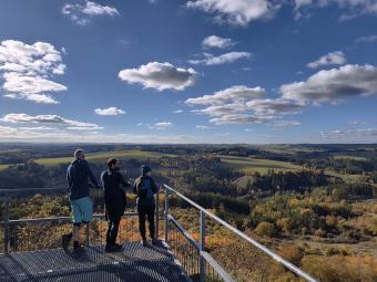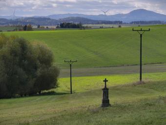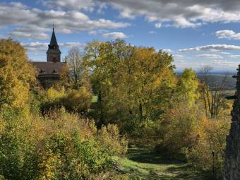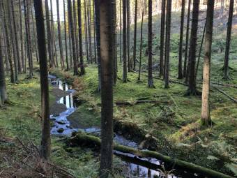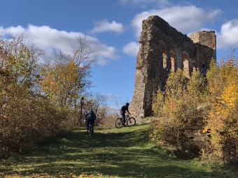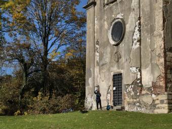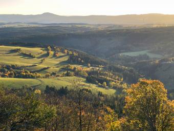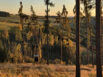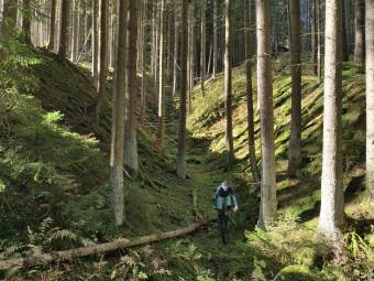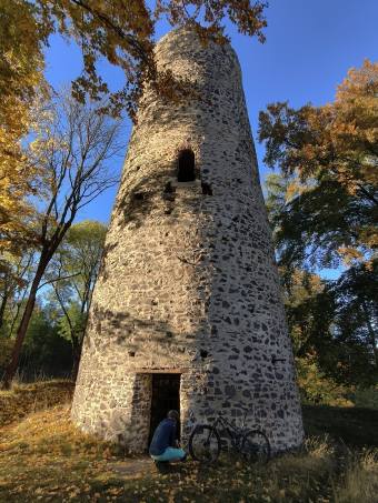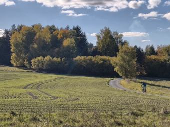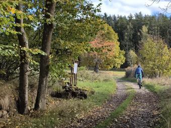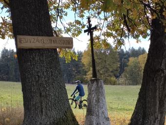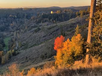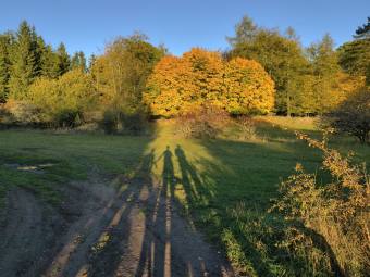 Sobota se nad námi rozmáchla modrou oblohou a v kombinaci se zlatými a zelenými stráněmi údolí Kosího potoka sváděla neodolatelně k focení. Díky tomu jsme měli ve čtyři odpoledne stále ještě zhruba polovinu trasy před sebou a průměrku 2,3. Časový skluz ještě vylepšila zastávka ve vysídlené Horní Vísce, zatímco Markét a Hubert na nás čekali v Dolní Vísce. Když jsme je konečně dojeli a začali vybalovat svačiny, Hubert se jal rezignovaně házet kaštany do trávy a nenávistně promlouvat k vesnickému čoklovi, který téměř nepřetržitě štěkal za plotem. Pokusili jsme se Huberta potěšit a trochu přišlápnout, takže na Krasíkov jsme dojeli v celkem nadějném čase. Cílem dne totiž bylo stihnout zlaté podvečerní světlo na Vlčí hoře, což se nakonec povedlo dokonale. Po zážitkovém sjezdu z Vlčáku v přibývajícím večerním chladu jsme se s povděkem vrátili k roztopeným kamnům starého hostince.