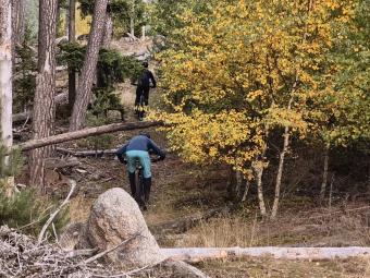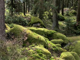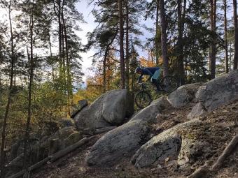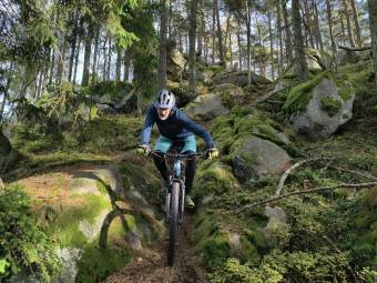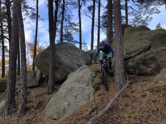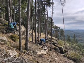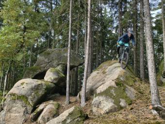 V neděli jsme se přesunuli o kus dál k jihu a plni entusiasmu se zanořili do lesů Sedmihoří. Dokonalý půlkruh nízkých hřbetů a vrcholů je pozůstatkem dávné sopky a je poset oblými balvany a skalkami hrubozrnné žuly. Trasa s nadějným názvem Nedělní krátká sváděla ke scestné myšlence, že to bude odpočinková kochačka, po včerejšku vlastně skoro nuda. Markét sice pronesla neurčité varování No uvidíte, ale že nám osmnáct kilometrů zabere celý den, jsem přeci jen nečekala :-) Nahoru a dolů mezi skalkami, občas taky HODNĚ nahoru a HODNĚ dolů, často s kolem jako zavazadlem. K tomu dva vzájemně se hecující bajkeři, podobně u vytržení jako když mateřskou školku vypustíte po zavíračce do cukrárny :-)