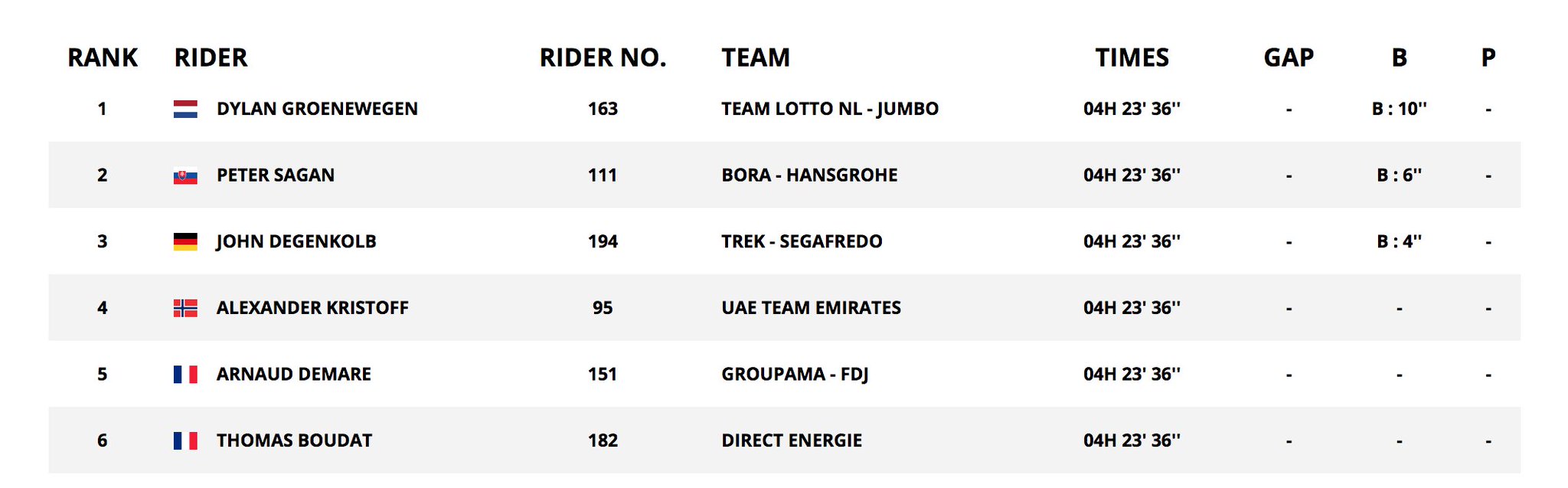 Pri rovnosti bodu rozhoduje, kdo je blize poctu jezdcu v zavode. Pak rozhoduje vyssi pocet dnu v cele. Pokud ani to nerozhodne, rozhoduje vyssi pocet bodu za GC.