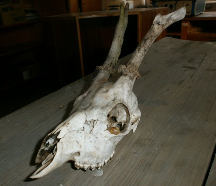 podobnou lebku sem viděl nedávno když sem byl sbírat ořechy.....akorát parohy měla mnohem hezčí než sou vidět tady(byly bílý a hlaďoučký).Ale nechal sem to tam ležet – nedovedu si představit kam bych to doma pověsil