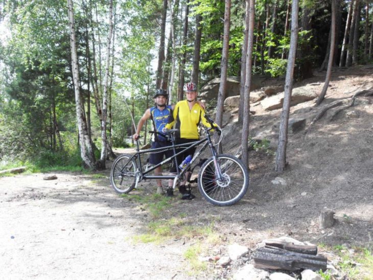 Brzdy zakladni Shimano+vzadu pomocne V,fici to pekne a ta bocni tuhost.....pekne se to vlni.Bohuzel znacka mi unikla..:(,ale je to serio,pujcene v info.na R.Stezkach