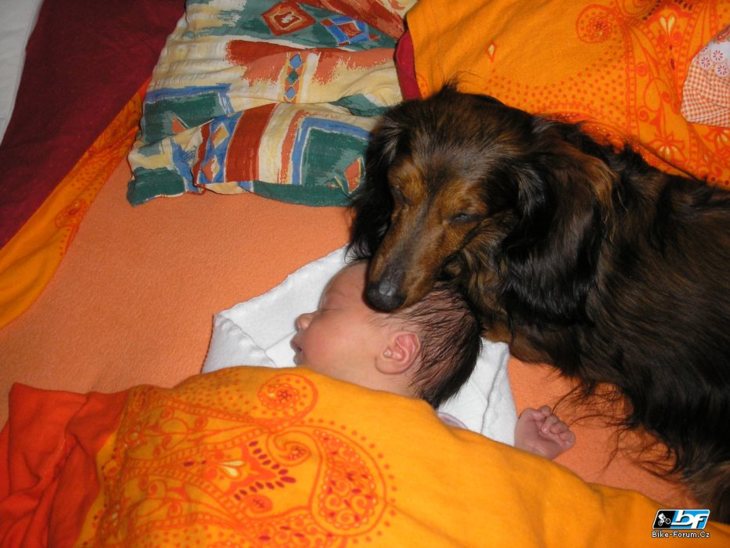 Zas tak bych se nebál, ikdyž člověk nikdy neví.. Viděl jsem v nějaké knížce o psech v takovéto situaci dokonce pitbulla a dítě. Prý to pes chápe téměř jako vlastní štěně, člena smečky.