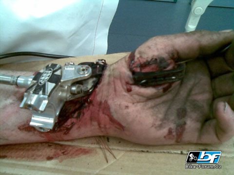Podľa popisu bol jazdec schopný stále brzdiť, tak že zatiahol celú ruku dozadu. Asi bolo treba, vyzerá to na prednú brzdu
