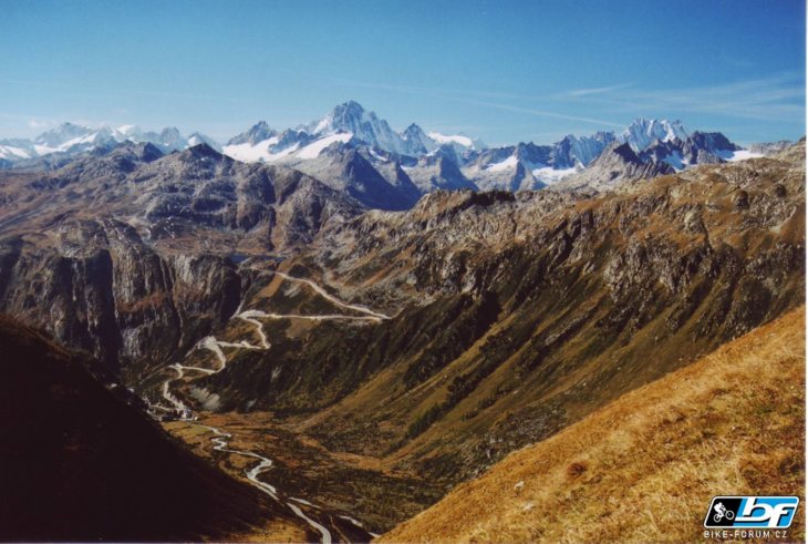 Krásná fotka a super viditelnost. Ten prostřední vrchol je nejvyšší hora Bernských Alp – Finsteraarhorn.