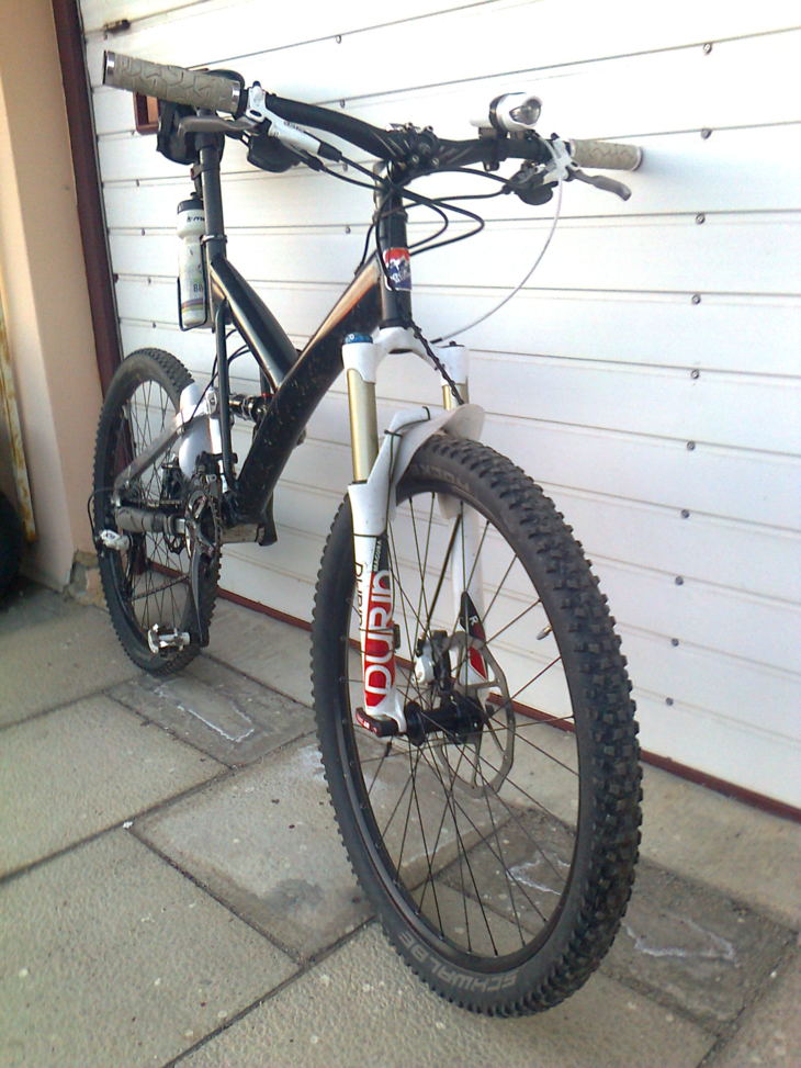 Kolo sestaveno z přebytků a bazarových dílů na ježdění do práce a blbnutí v okolních kopcích. Překvapivě velmi pohodlné a snad něco vydrží. Zadní stavba po upravě zavěšení tlumiče zdvih 120mm, jezdím se sagem cca 40% a supr. Ideální na trénování fyzičky. Fotky z mobilu.