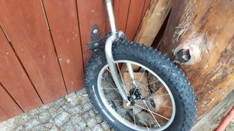 Další zrecyklovaný komponent. Tata našel na sběrném dvoře Ohnuté dětské kolo12". Z přední a zadní vidlice,kol z minibiku koupených na burze za stovku a pár jeklíků má Eli koloběžku. Středová mufna ( po osoustružení) mi poslouží na fatbika. Bo Favoriťácké bohužel nejsou použitelné, bo jsou lisované z plechu a mají moc velké vylisované díry na letování trubek