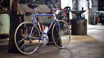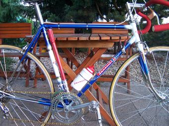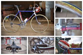 Lepší rám který je z roku 1964 – tady byla volba jasná. Snažil jsem se udělat kolo dle vzoru Smolíkova vítězného kola ze ZM 1964. Získal jsem ho přímo od bývalého závodníka který ho měl od roku 64. Kolo prý bylo modrobílé s chromovanými vidlicemi. Rám se ke mě dostal ve stříbrném komaxitu s nálepky Peugeot. Za zmínku stojí na tu dobu atypické a dost protažené salámky zadních vzpěr. Sedlovka Campa 26.2 tam decentně kvrdlala, 26.4 padla jako ulitá. Pumpička je italská Silca s náhubkem Campagnolo.
