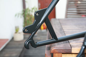 Postavil jsem single speed ale rafkove brzdy mi vadili. Po roce jsem odvezl ram do Cyklo Bares pro „tuning“: konzole kotoucovych brzd a levna cerna barva.