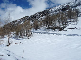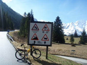 Silnice ještě není celá protažená. V noci na kopcích sněžilo a tak jsem dojel do 1.850 mnm a tam konečná, cca 10 cm sněhu. Silnice je ještě plná popadaných klacíků a občas někde kamení. Na místě kam jsem dojel, tak bylo kolem 0 st.C. Na protějších kopcích padají laviny, jsou hezky vidět v pohybu se zvukovým doprovodem. Oficiálně se silnice otevře začátkem května, ale týden před otevřením už je připravena a to je ideální čas na kolo, neb auta tam ještě nemohou.