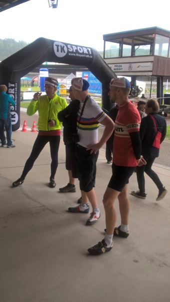 Zlínský tým. Zprava ,servisman, ředitel týmu, jezdec v jednodenním angažmá, za bariérou masér, taktéž zdatný moderátor, a zkušební jezdec.