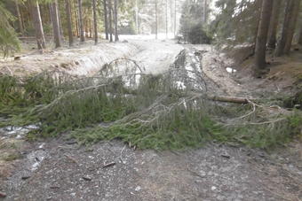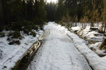 V lese se ještě sem tam najde led a sníh