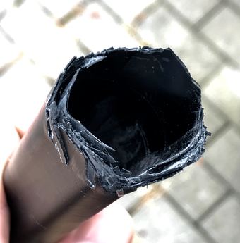 Vrstvy tkaniny jsou od sebe takto delaminovane, protoze se trubka nelamala, ale tocila na krut. Pokud to neni sklo, uleti vzdy vrstvy od sebe.