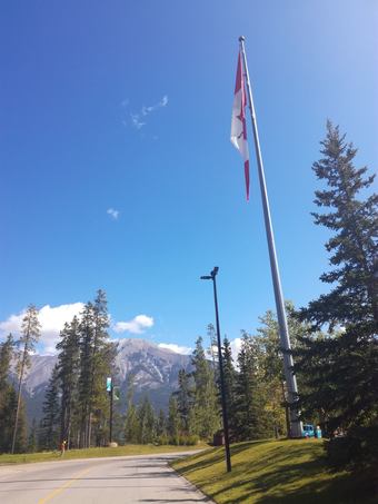 Kanadská vlajka nesmí chybět, v pozadí hora Lady McDonald, ze shora byl pěkný výhled.