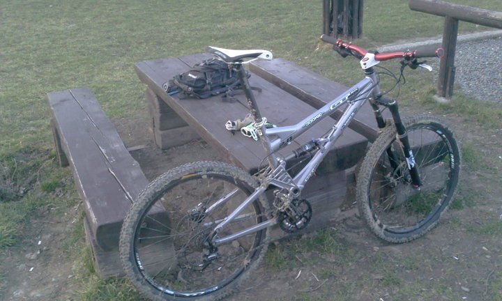Kolo značky GT Force, jedna se o celopéro, je starší a má stříbrnou barvu, nepřehlednutelné červené široké řídítka