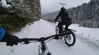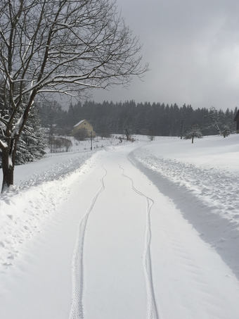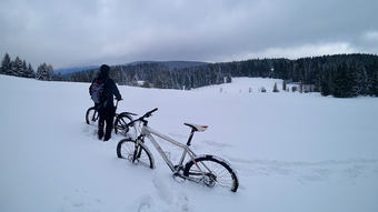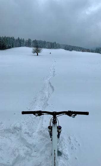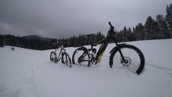 Během jednoho dne napadlo několik desítek cm, takže vychozené stopy bohužel nebyly, ale páteční vyjížďka byla jasná. Bohužel tentokrát nezabrala metoda „rozhrnovače" pomocí ebiku s širokými plášti, takže jsme občas tlačili oba.