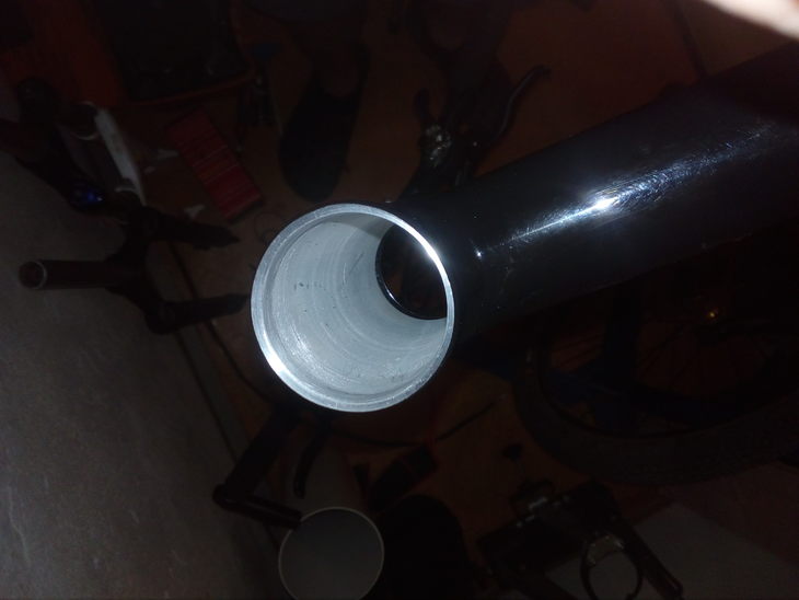 Vilém: Nejsem si jistý jak by oslabení trubky pomohlo v pevnosti. Na fotce jde vidět to vyosení. V levo fréza ani nesáhla, vpravo je profrézované celé zesílení + lehce frézováno do dalšího průměru.Nebudu řešit, budu jezdit a čas ukáže.
