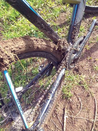 Nedávno jsem tu do nebe vychvaloval mé nové 40 mm gumy Michelin Power Gravel, jak drží na suchu, mokru, trávě a dokonce i blátě. Vše je samozřejmě pravda, ale znamená to také, že zase bláto skvěle drží na nich. Takto jsem dopadl ve středu ráno, kdy jsem zavezl auto do servisu v OL a opojen slunečným dnem jsem se do práce vydal mou oblíbenou cestou mezi poli. Po celonočním vydatném dešti by rodilý Hanák nevyjel mimo asfalt ani pásovým traktorem, já jsem holt přistěhovalec, tak ještě sbírám zkušenosti :-)