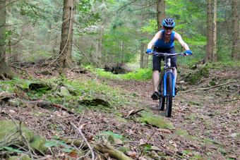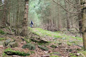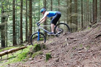 Fotky pěšinky v lese bez jezdce (jezdkyně) by byly úplně o ničem. Takhle je vidět, že to je opravdu prudký podle pozice na kole.