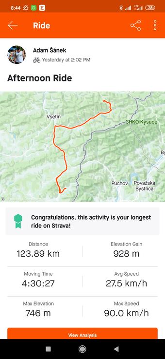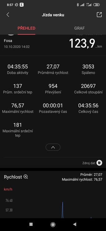 Sjezd ze Soláně, maximálka se mi na třikrát liší, 76 hlasí appka hodinek, 90 strava, tachár tvrdí 81km/hod. Ten je dle mého nejblíže. Každopádně pak jsem vypínal levou nohu abych se vešel do zatáčky.