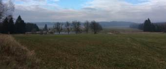 Pohled od hraničního kamene k bizoní farmě.
