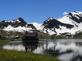 Fotogenická Fruttkapelle je na opačném konci jezera.
