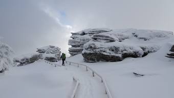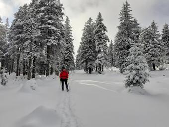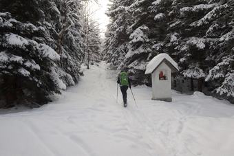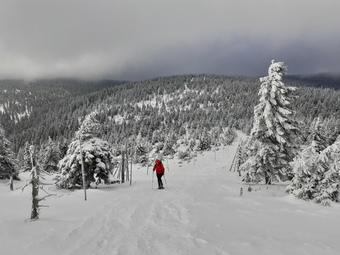 Od Kamenného okna na vrchol Červené hory moc lidí nechodí. Žlutá značka bývá od místa, kde se odděluje zelená až po Bílý sloup v zimě velmi často neprošlapaná.