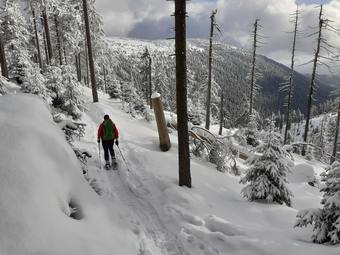 Pohodlná vyšlapaná zelená sněžnicová magistrála do Sedla pod Vřesovkou