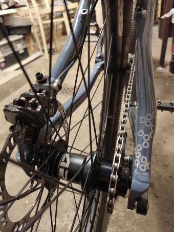 Přivařen IS disc mount - napleteno totál jude zadní kolo - náboj Tanke Single Speed, dráty a niple co byly doma. Navářka neseděla výškově, tak se musel brousit samotný adaptér.
