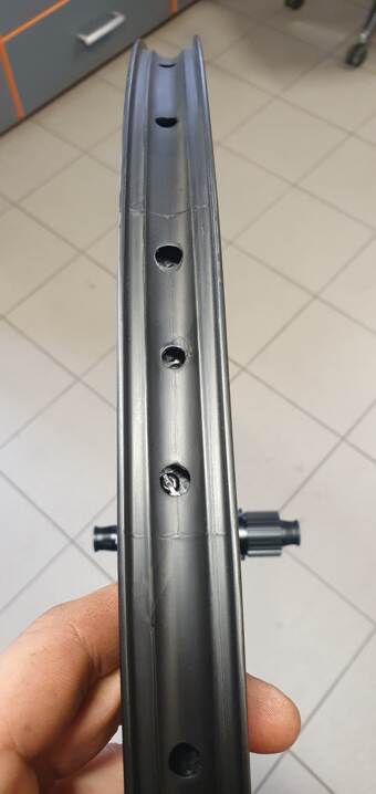 Docela mě po sundání bezdušové pásky zarazilo zpracování karbonového ráfku enve m525. Povrch ráfku je dost hrubý, spoje vystupující přes 1 mm a jako největší prasárna mi přijdou díry na nyple z kterých lezou otřepy karbonových vláken a trhají se směrem do plochy. Pro porovnání první 2 fotky o polovinu levnější ráfek Idea. Na funkci rostlináře to asi nebude mít vliv, ale čekal bych od takové značky trochu lepší zpracování.
