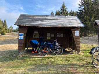 Turistický přístřešek na Lesn. Super spaní vyzkoušené již na loňských Mílích. Kryté ze 3 stran, nefouká tam. Spí se tam dobře.