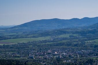 Velký Javorník a pod ním skokanské můstky ve Frenštátě