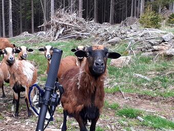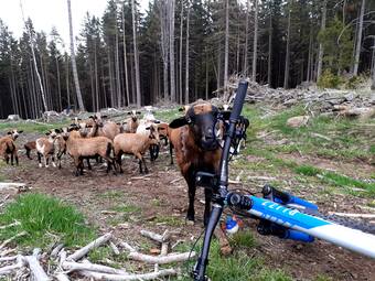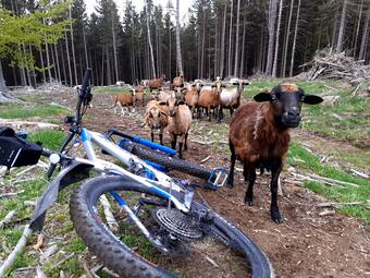 … a najednou stádečko zdivočelých ovcí. Slezla jsem z kola a ony se za chvilku osmělily a přišly se podívat blíž. Ta nejhlavnější okoukla moje brýle a když zjistila, že k sežrání u mě nenajde nic, přestala jsem ji zajímat. Když jsem odjížděla z paseky, postupně si polehávaly na noc na suché jehličí..