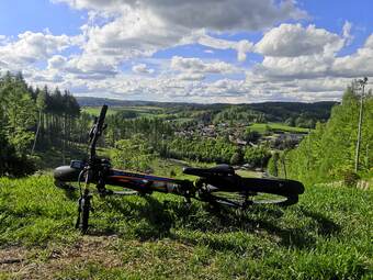 Včera mi to co se týče počasí nevyšlo, tak jsem dnes vyrazil znovu, vybaven větrovkou a blatníky. Zatímco blatníky se dočkaly své funkce, větrovka zůstala na zádech v pytlíku, což bylo určitě dobře. Včera se o mě pokoušel infarkt ve stoupání na torzo rozhledny na Šacberku, dnes jsem na tom byl podstatně lépe. Vyjel jsem pozdějc odpoledne, až jsem měl jistotu, že mě to zase někde nechytne jako včera. Fotky nebudu dávat ty podobné (stejné) jako včera, jen dám místa, kam jsem včera nezabloudil. Trasa zde: Bylo toho 32 km, a 521 výškových metrů.