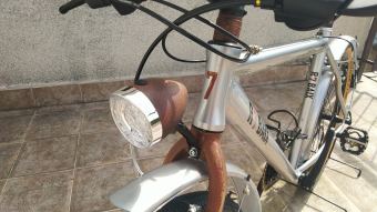 Pěkný výsledek karantény, jako celek je to moc sympatické. A teď pitva: kožené gripy se zlatou objímkou, k tomu zlaté víčko představce – šmakózní. „Surové“ lakování vidlice a lampy plus stejný šmirgloidní styl i na sedmičce na logu – vymazlené. Ukazatel převodů na řídítkách – lahůdka. Ale co by to bylo za pitvu bez trochy té patologie: lakování na vidli zřejmě doplatilo na nějaký (posthospodský? :-)) karambol, sedlo bych měla obavu, že za chvíli skončím na štangli, zlatý řetěz tam moc nelahodí a ten dysbalanc šestadvacítky kola a dlouhé vidlice (nevím, na 27,5, 29?) tam dělá binčus s předním blatníkem a za mokra to možná boty (možná i něco víc) odnesou.